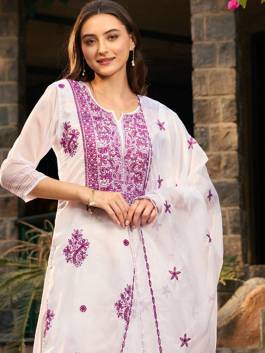 Dhiyona IE White Ethnic Motifs Embroidered Organza Straight Kurta & Trouser With Dupatta