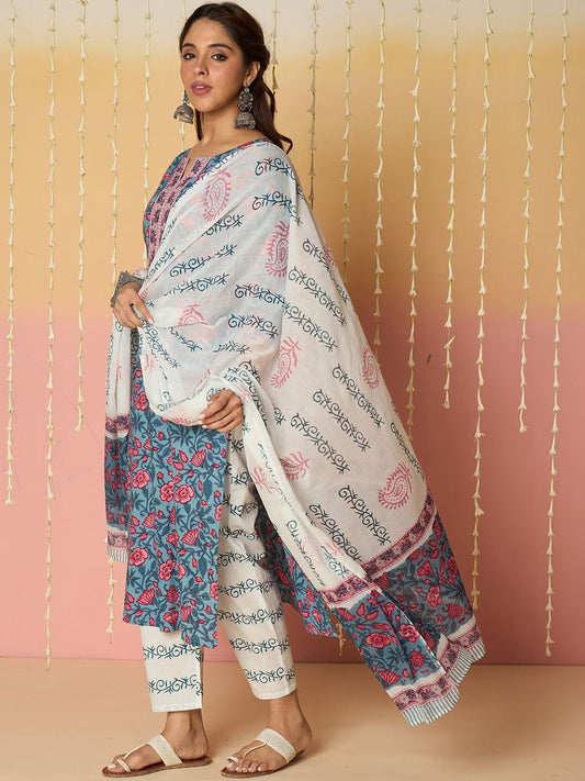 Dhiyona IE Floral Printed Straight Kurta With Trousers & Dupatta