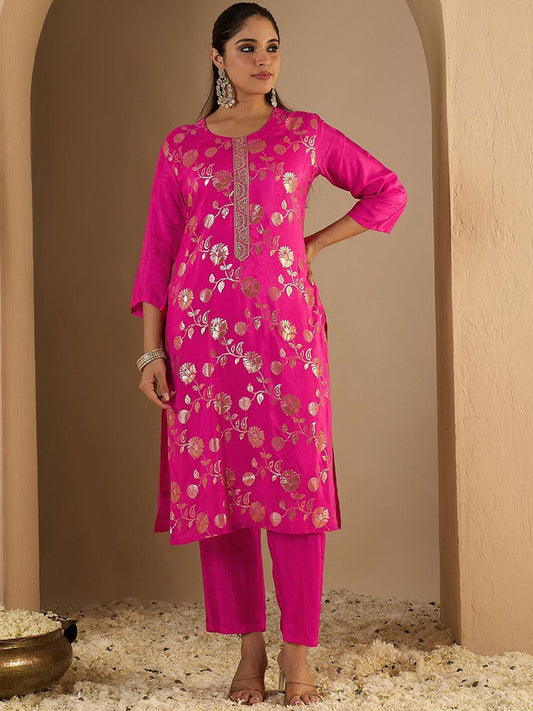 Dhiyona IE Floral Embroidered Regular Chanderi Silk Straight Kurta with Trousers & Dupatta