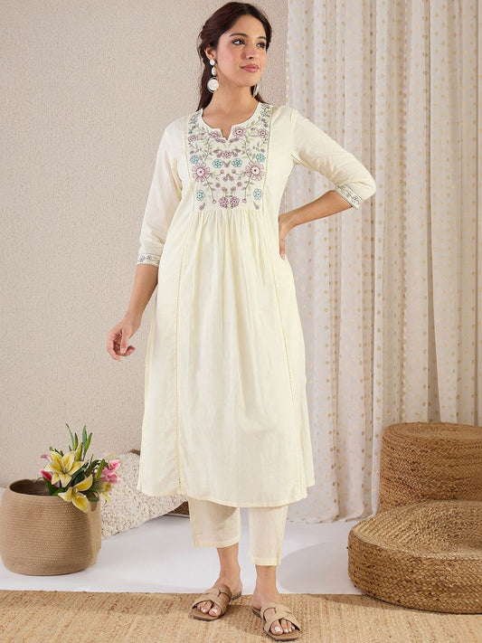Dhiyona IE Floral Embroidered Beads And Stones V-Neck A-Line Pure Cotton Kurta With Trousers