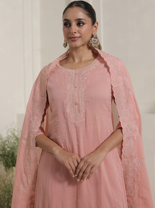 Dhiyona IE V Neck Floral Embroidered Pure Cotton Kurta with Trouser & Dupatta