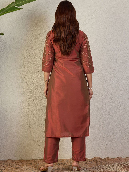 Dhiyona IE Floral Embroidered Round Neck Thread Work Straight Kurta & Trousers