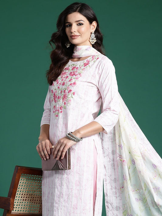 Dhiyona IE Floral Embroidered Notched Neck Cotton Straight Kurta with Trousers & Dupatta