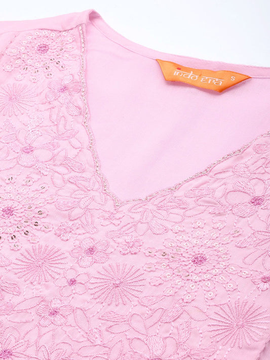 Dhiyona IE Floral Embroidered Notch Neck Sequinned Straight Kurta With Trousers & Dupatta