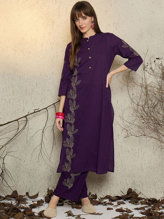 Dhiyona IE Floral Embroidered Mandarin Collar Thread Work Pure Cotton Kurta With Trousers