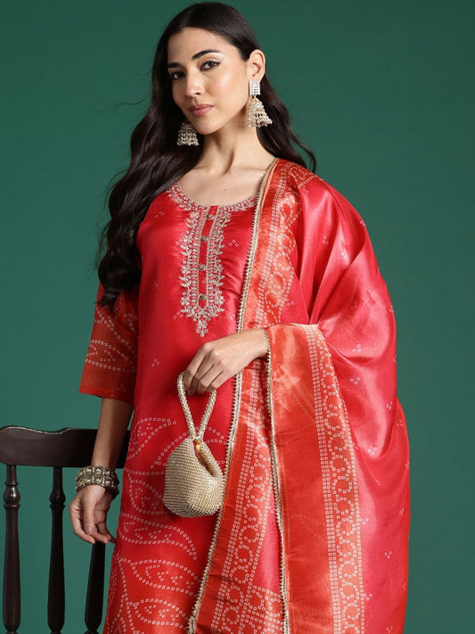Dhiyona IE Floral Embroidered Thread Work Straight Kurta With Trouser & Dupatta