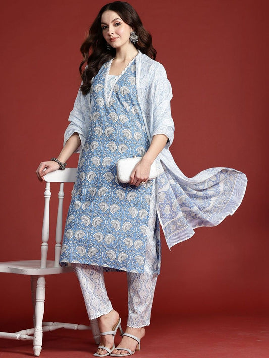 • Women Printed Regular Pure Cotton Kurta with Trousers & With Dupatta
