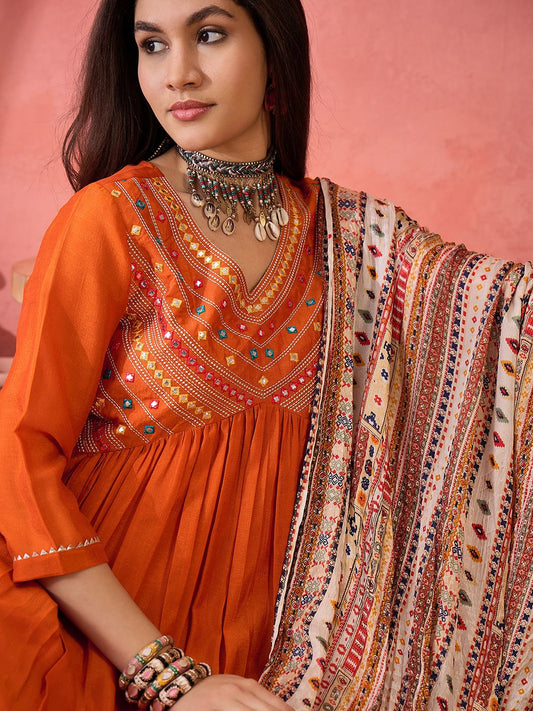 Buy 2 Get 1 FreeVendor:Dhiyona SNDhiyona SN Women's Orange Mirror Work V-Neck Empire A-Line Kurta With Trousers And Dupatta