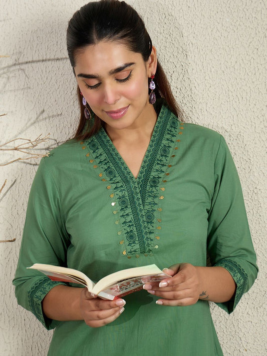 Dhiyona IE Women Ethnic Motifs Embroidered Sequinned Pure Cotton Kurta with Trousers