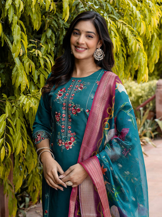 Dhiyona VV Women's Embroidered Silk Blend Calf Length Straight Kurta with Palazzo & Dupatta Set