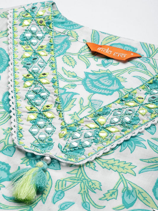 Dhiyona IE Women Floral Printed Mirror Work Pure Cotton Kurta with Trousers & Dupatta