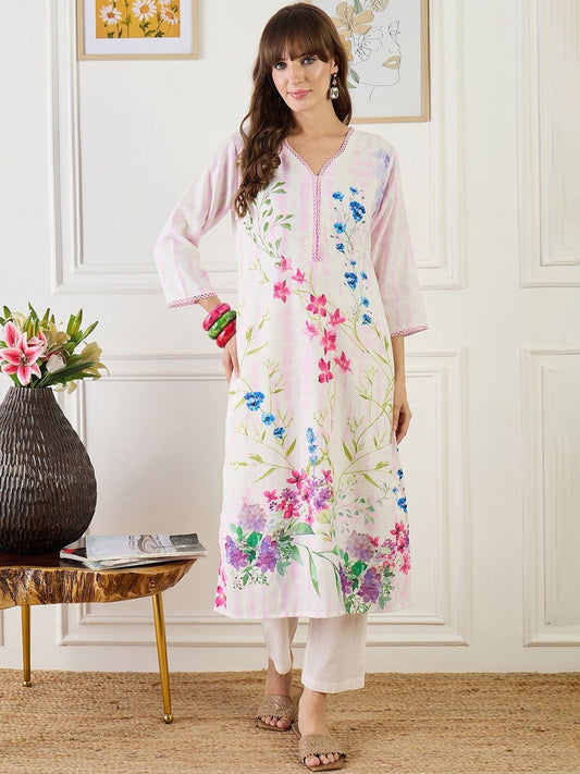 Dhiyona IE Floral Printed Round Neck Pure Cotton Straight Kurta With Trousers