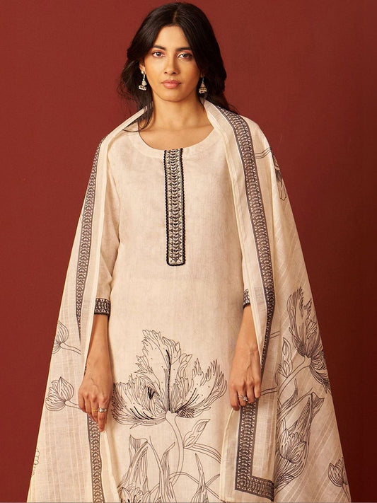 Dhiyona IE Women Floral Printed Regular Thread Work Linen Kurta with Trousers & With Dupatta