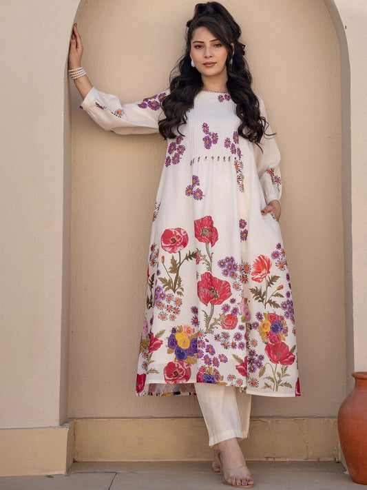 Dhiyona IE Women Floral Printed Pleated Pure Cotton Kurta with Trousers