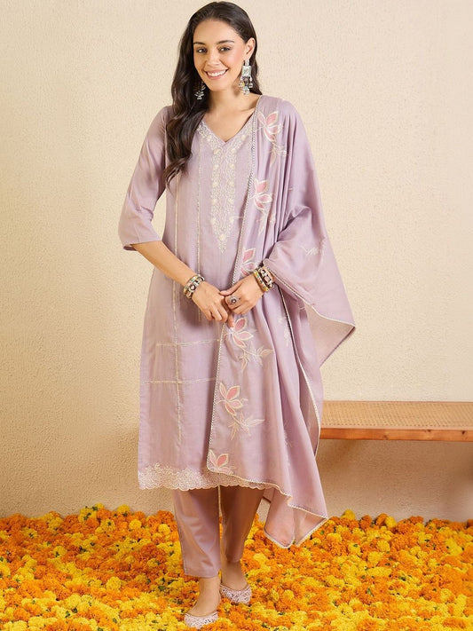 Dhiyona IE Floral Embroidered V-Neck Liva A-Line Kurta With Trousers & Dupatta