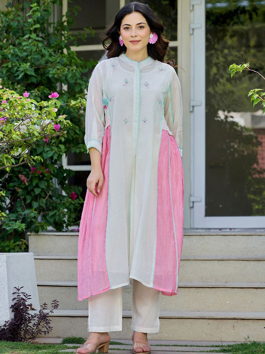 Dhiyona IE Floral Embroidered Thread Work Pure Cotton A-Line Kurta With Trousers