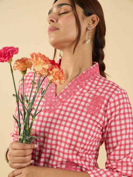 Dhiyona IE Women Checked Regular Thread Work Pure Cotton Kurta With Trousers