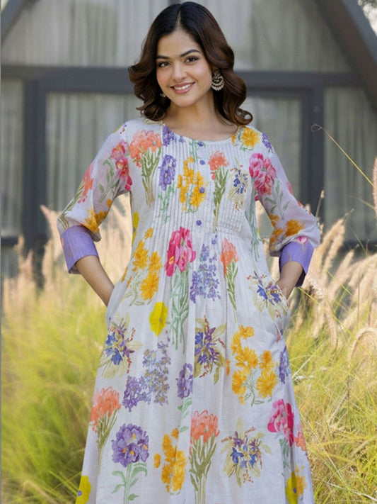Dhiyona IE Women Floral Printed Pleated Pure Cotton Kurta with Trousers