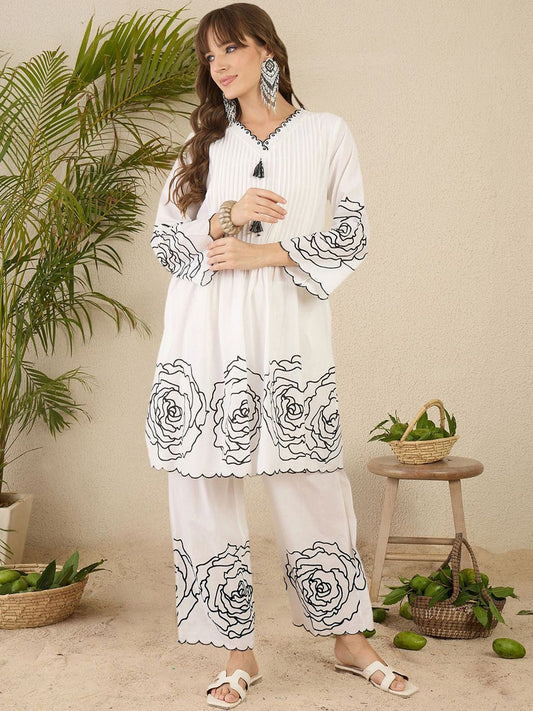 Dhiyona IE Floral Printed Thread Work Pure Cotton Kurta With Palazzos