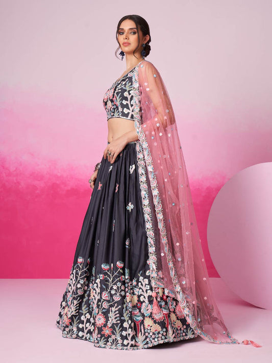 Women Grey Satin Silk Sequin embroidery Lehenga choli & Dupatta