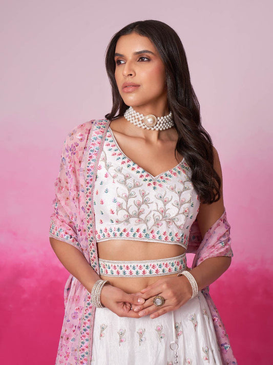 Women Cream Pure Chiffon Sequins and thread embroidery Lehenga choli & Dupatta