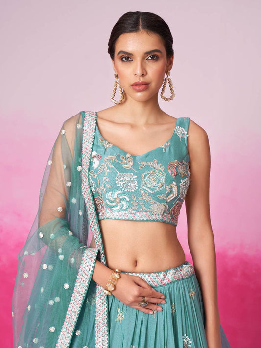 Women Teal Pure Georgette Sequins and thread embroidery Lehenga choli & Dupatta