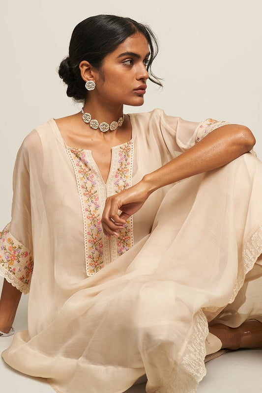 Buy 2 Get 1 FreeVendor:Dhiyona GFWomen's Almond Milk Organza Kaftan With Multi Colour Thread Embroidery With Lace Detailing