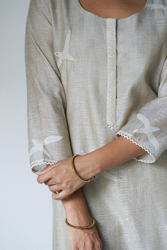 Women's Light Grey Woven Kurta With Cotton Satin Bottom