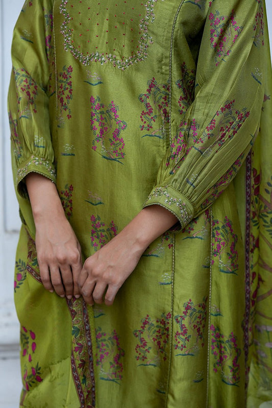 Women's Celery Green Bemberg Raw Silk Embroidered Co-ord Set