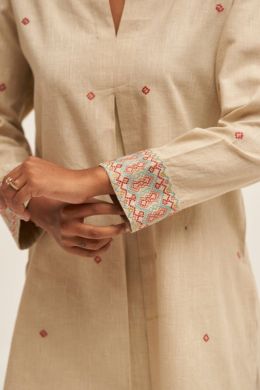 Buy 2 Get 1 FreeVendor:Dhiyona GFWomen's Fog Beige Viscose Chanderi Woven Kurta Suit Set With Embroidery and Hand Work Detailing