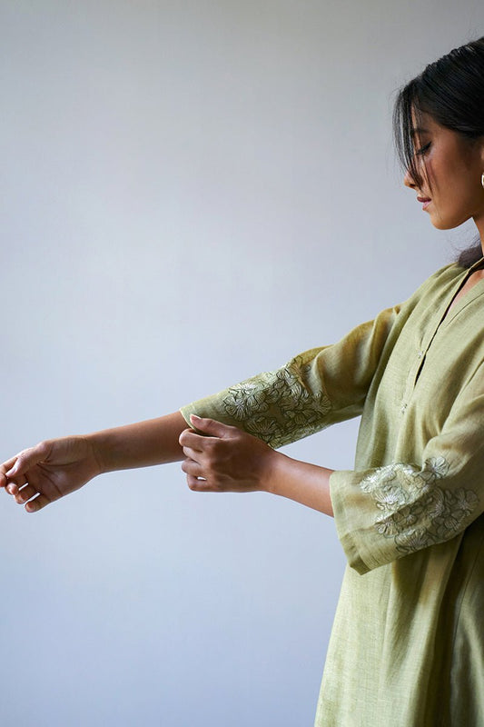 Women's Green Sand Silk Embroidered Sleeve Kurta With Cotton Bottom