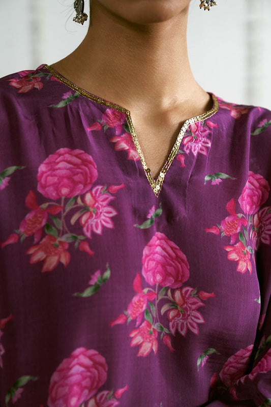 Women's Deep Plum Bemberg Kataan Silk Floral Printed Co-ord Set
