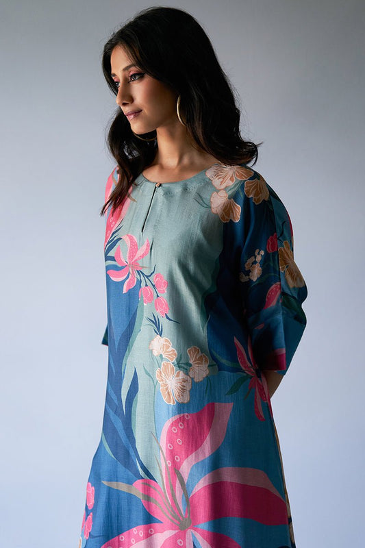 Women's Midnight Blue, Pink and Pistachio Mix Colour Bemberg Silk Printed Co-ord Set