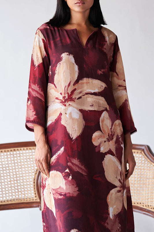 Women's Maroon and Beige Bemberg Silk Printed Co-ord Set