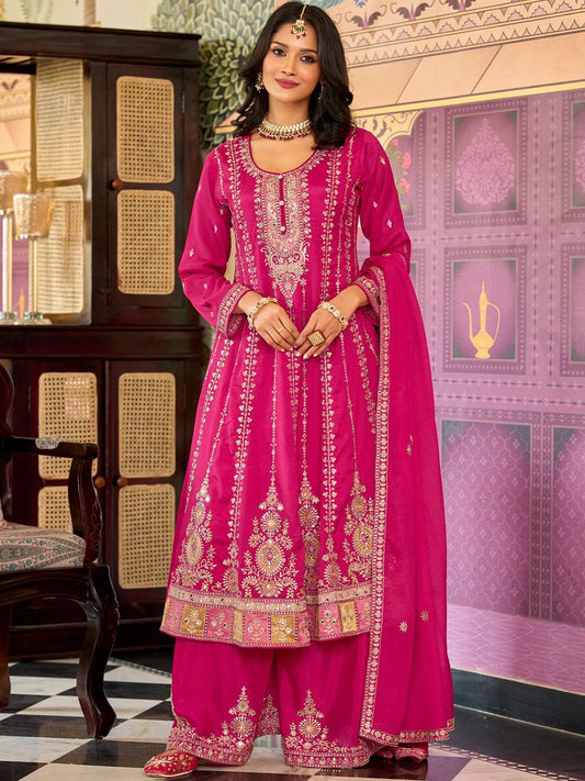• Ethnic Motifs Embroidered Chinon Beads And Stones Kurta With Palazzos & Dupatta