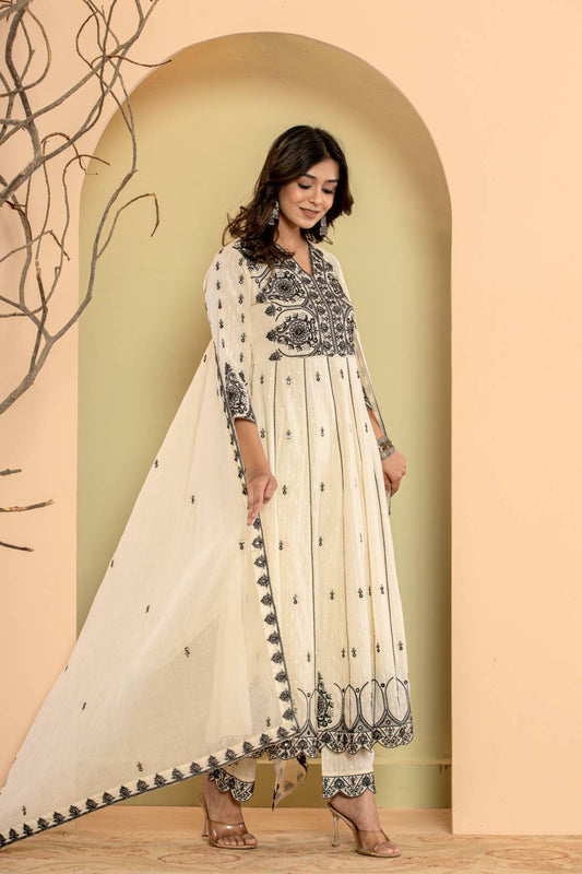 Dhiyona VR Women's Off-White Mirror And Thread Work, Scallop Lace Anarkali Kurta Paired Wirh Embroidered Bottom And Dupatta