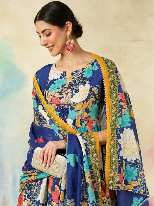 Women Blue Floral Anarkali Kurta Pant and Dupatta Set