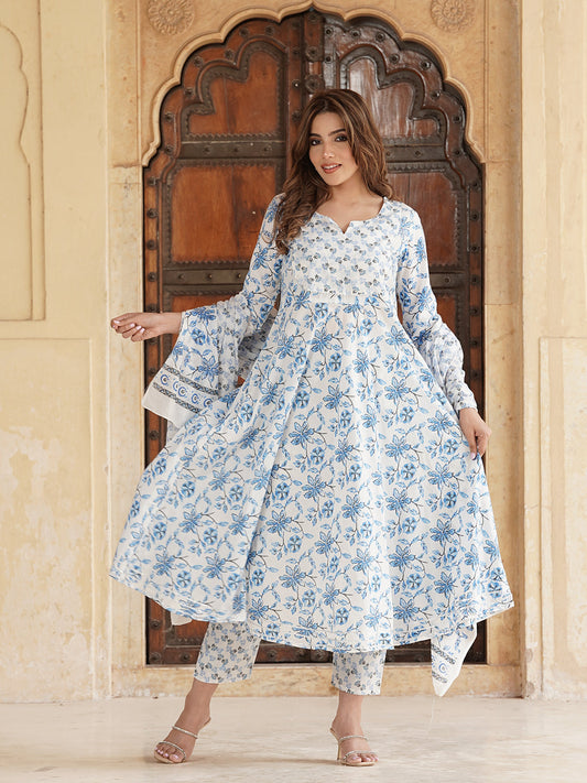 Blue and white Floral Printed Gotta Patti Pure Cotton Anarkali Kurta with Trousers & Dupatta