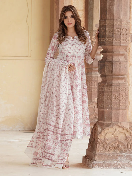 Women's Floral Printed Pure Cotton Anarkali Kurta With Trousers And Dupatta