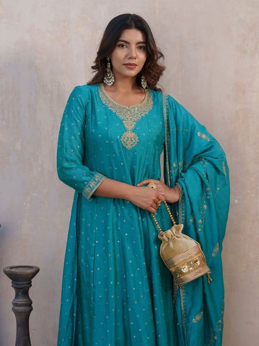 Dhiyona VV Women's Embroidered Silk Blend Anarkali Kurta Pant With Dupatta Set