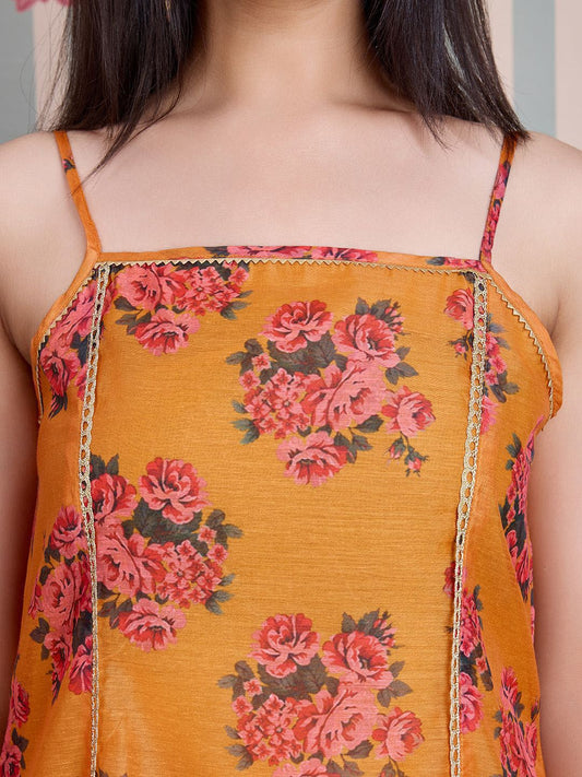 Floral Printed Angrakha Pure Cotton Anarkali Kurta With Trousers & Dupatta