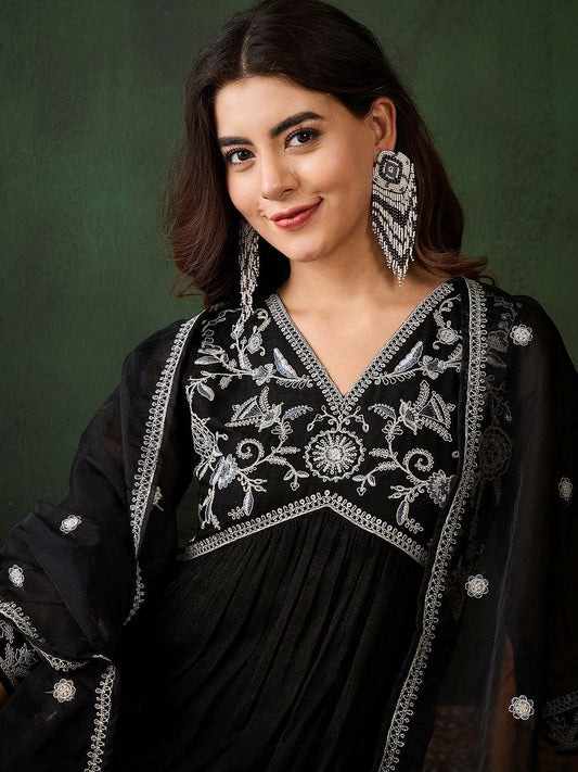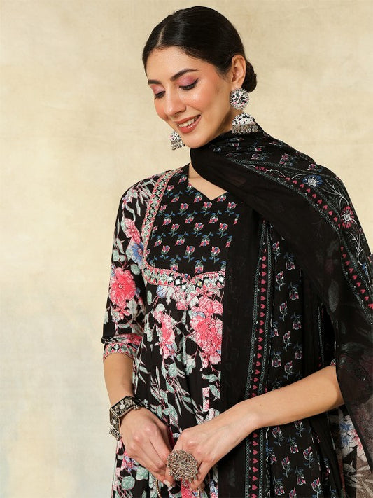 Dhiyona VR Women's Black Floral Printed Embellished Anarkali Kurta Paired With Bottom And Printed Dupatta