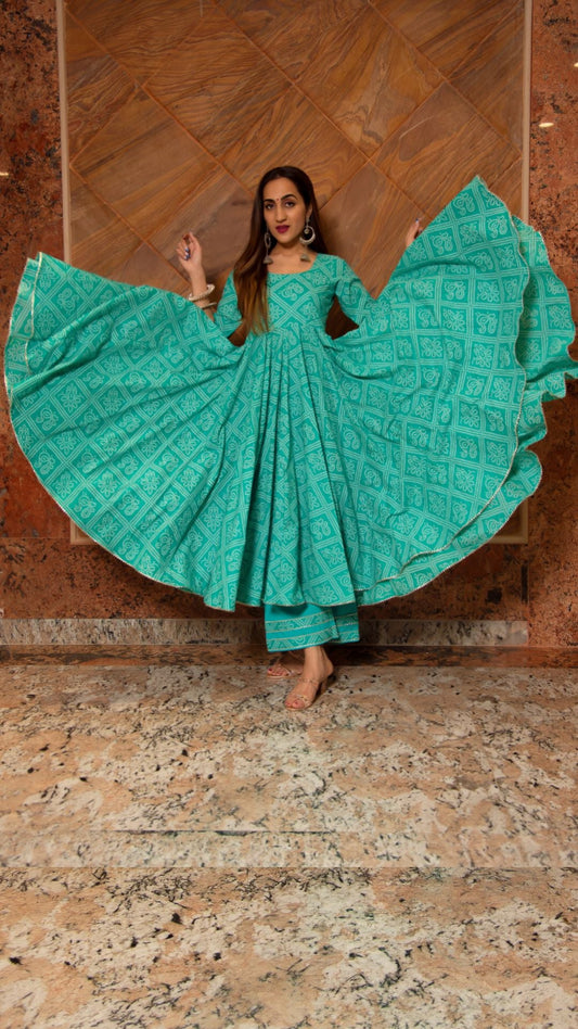 Bandhej Tiffany Blue Cotton Anarkali Set