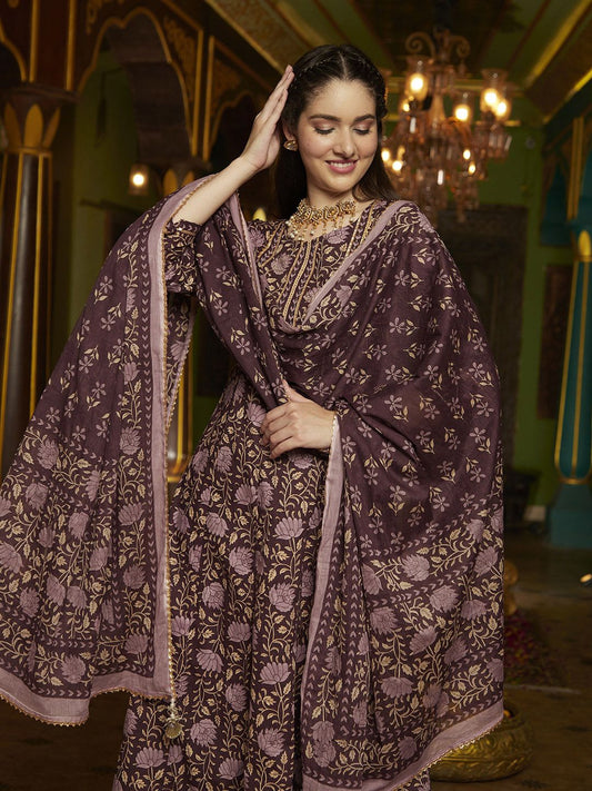 Women Mauve Floral Anarkali Kurta Pant Dupatta Set