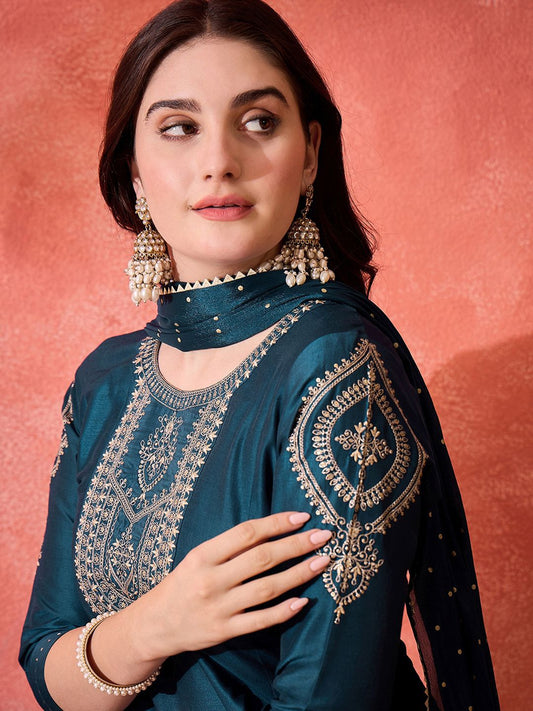 Women Teal Floral Anarkali Kurta Pant and Dupatta Set