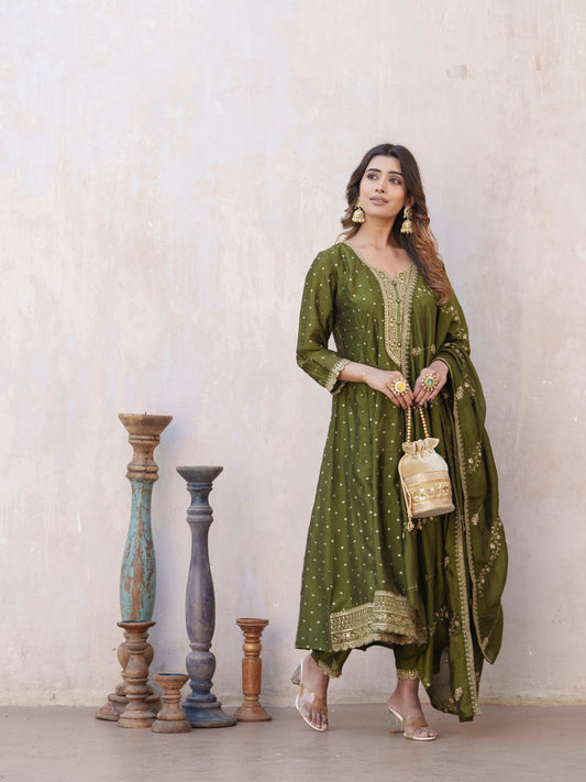 Dhiyona PD Women Bandhani Printed Panelled Anarkali Kurta With Trouser & Dupatta