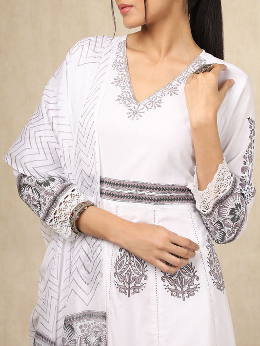 Floral Printed Angrakha Pure Cotton Anarkali Kurta With Trousers & Dupatta