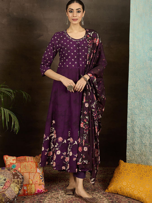 Dhiyona IE Women Floral Embroidered Cotton Anarkali Kurta with Trousers & Dupatta