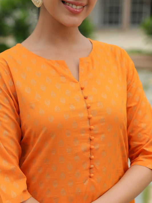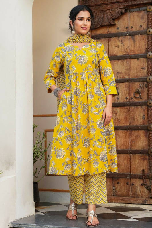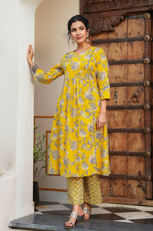 Women's Anarkali Soft Cotton Gold foil Print Women's Kurta Set - Yellow