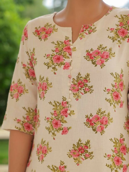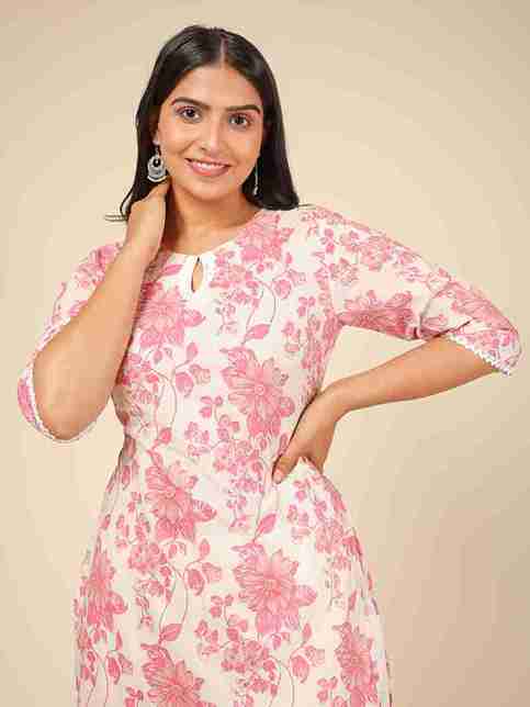 Women's A-line Linen Cotton Floral Print Women's Kurta - Pink